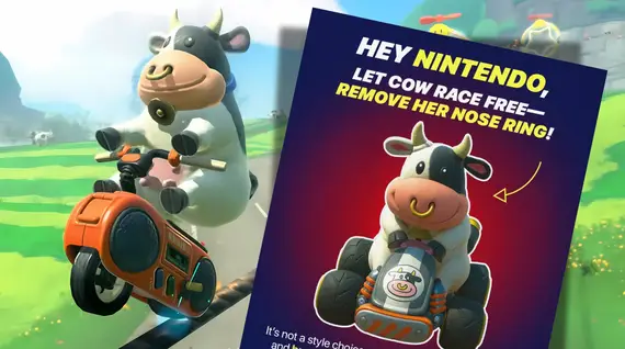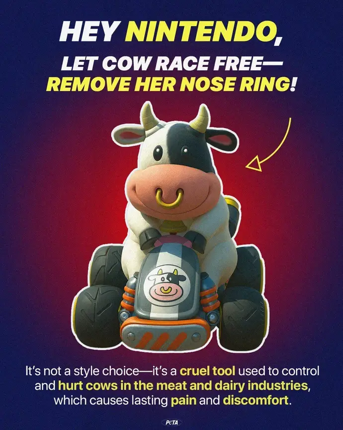 “我们知道《马力欧赛车世界》只是一款游戏,而这正是为什么奶牛的鼻环必须被移除的原因。”该组织表示,“《马力欧赛车》本应是一个充满乐趣的逃避现实的方式,而不是让人们想起在肉类和乳制品行业中用于奶牛身上的痛苦工具。没有人希望在赛车道上飞驰时还要去想动物的痛苦。”