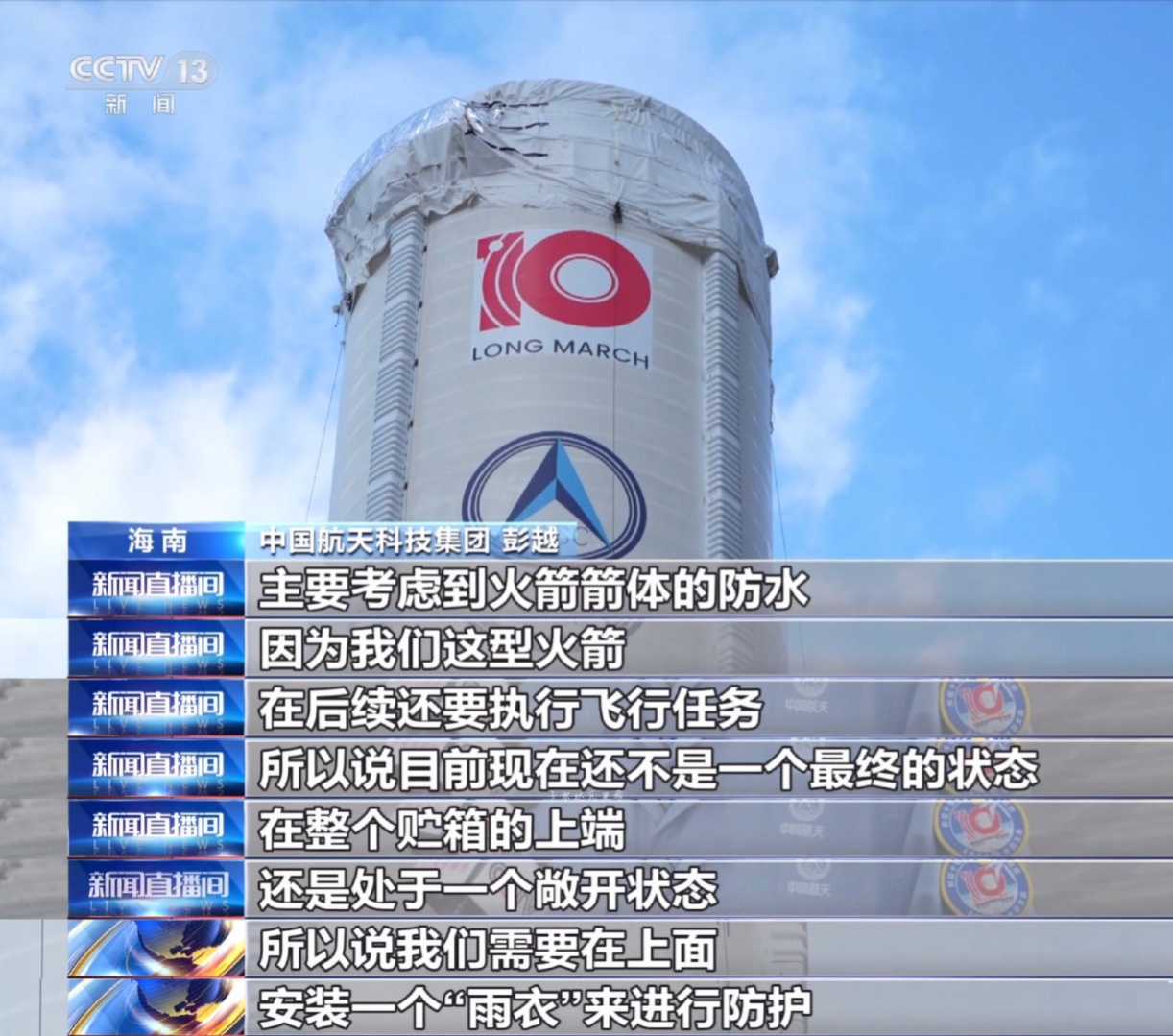 IT之家从中国航天科技集团彭越介绍获悉,主要考虑到火箭箭体的防水,因为这型火箭,在后续还要执行飞行任务,所以说目前现在还不是一个最终的状态,在整个贮箱的上端,还是处于一个敞开状态。所以说需要在上面安装一个“雨衣”来进行防护。