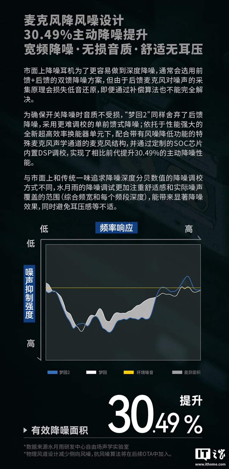 这款耳机配备 13mm 全频双悬挂环形平面磁单元,内置水月雨定制 TWS-01 芯片,提供单前馈式降噪设计,号称实现了相比前代提升 30.49% 的主动降噪性能。