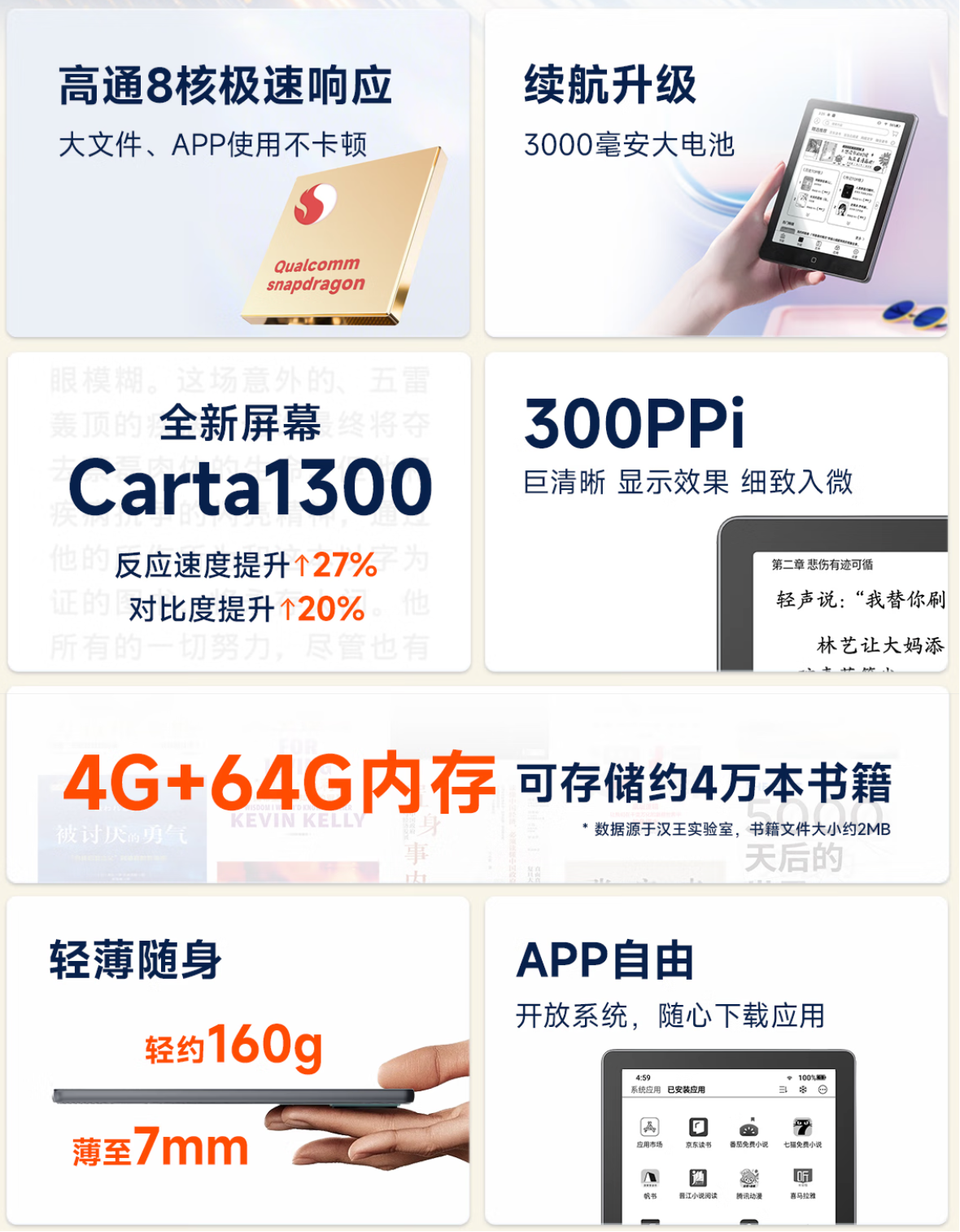 配备 6 英寸 1024×758 分辨率黑白墨水屏,支持 DM-Clear 双模态残影自清技术,装配 30 级 DC 调光的冷暖阅读灯。
