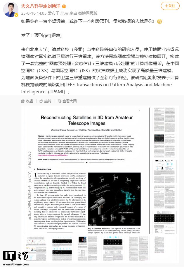 IT之家 8 月 17 日消息,镜盾科技 CEO 刘博洋昨日透露,他们联合北京大学、中国科学院等单位完成了一项研究,通过地面业余望远镜图像对真实轨道卫星进行了三维重建。