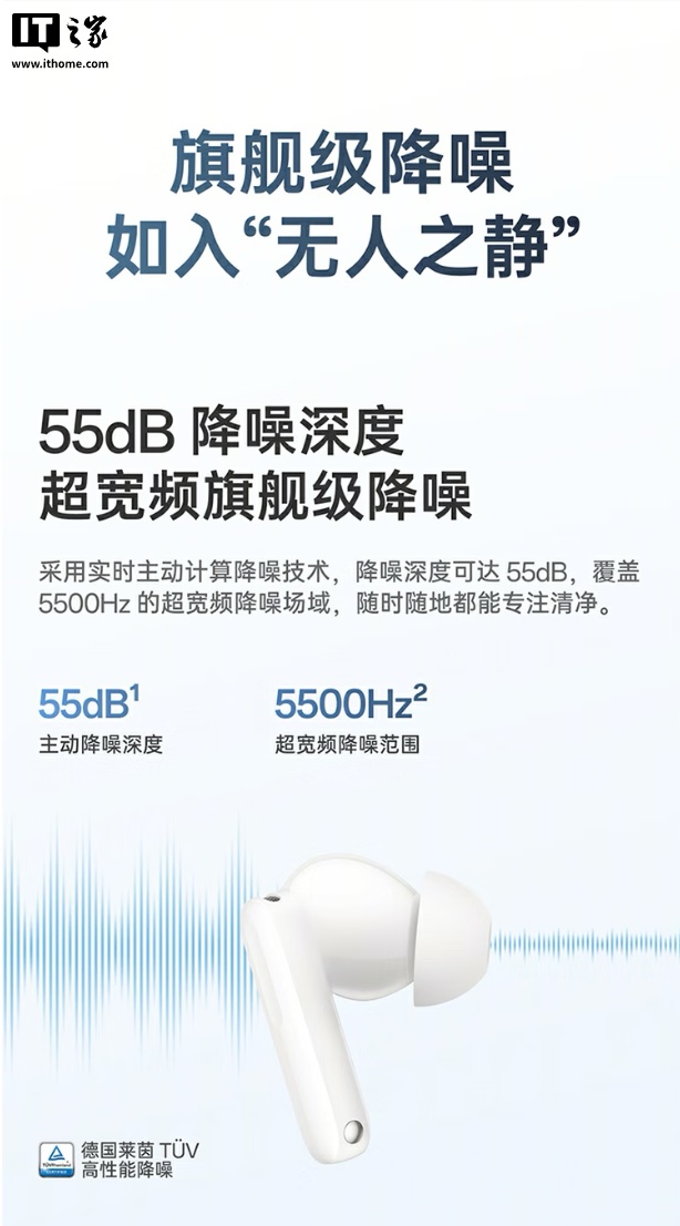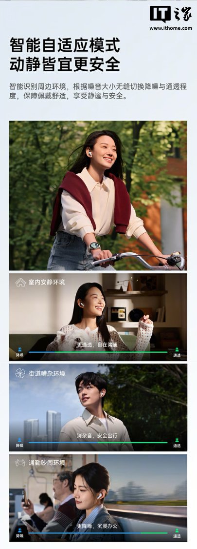 据介绍,这款耳机采用实时主动计算降噪技术,其降噪范围可达 5500Hz,主动降噪深度可达 55dB,内置智能自适应模式,可根据噪声大小自动切换降噪与通透模式,平衡降噪和路上安全。