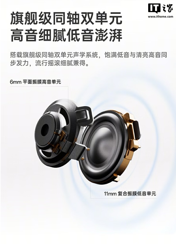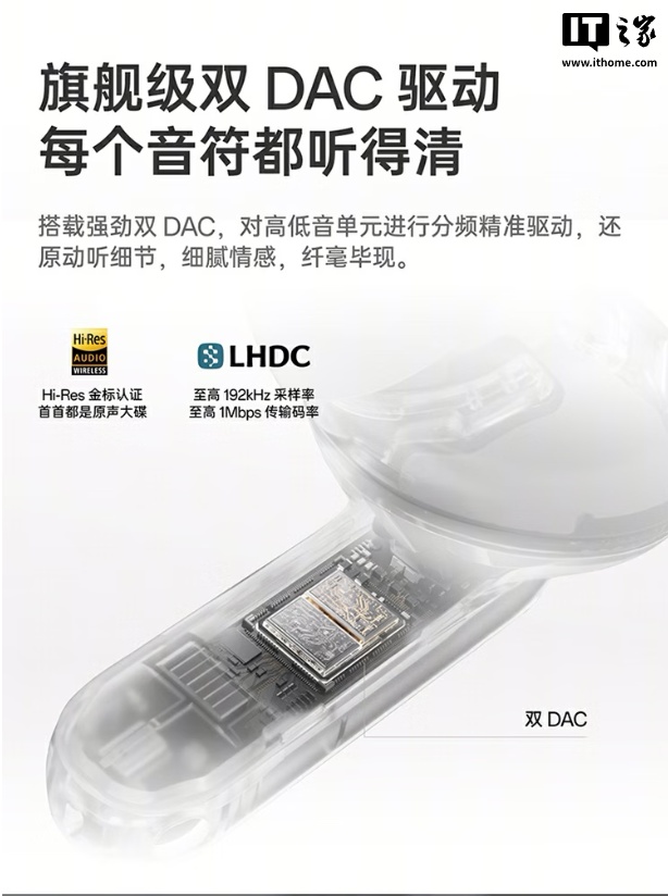 硬件方面,这款耳机搭载同轴双单元声学系统,内置 11mm 复合振膜低音单元、6mm 平面振膜高音单元,配有双 DAC 系统,可对高低音单元进行分频驱动,自带 Hi-Res“小金标”,支持 LHDC 无损音频传输。