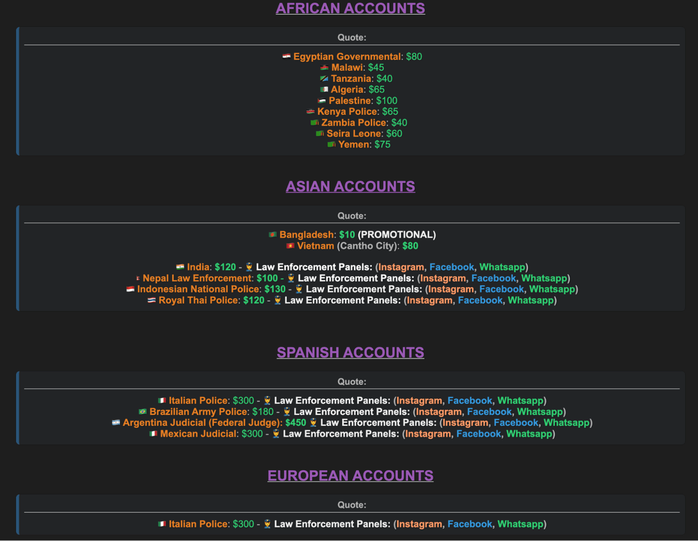 根据该情报机构的调查,此类交易通常出现在 Telegram、Signal 等加密社交平台,通常使用加密货币作为支付手段,买家可得到完整的 SMTP / POP3 / IMAP 凭证,涉及关联美国、意大利、巴西、阿根廷、墨西哥、孟加拉国、越南、印度、泰国、尼泊尔、印度尼西亚等国官方机构的电邮地址。