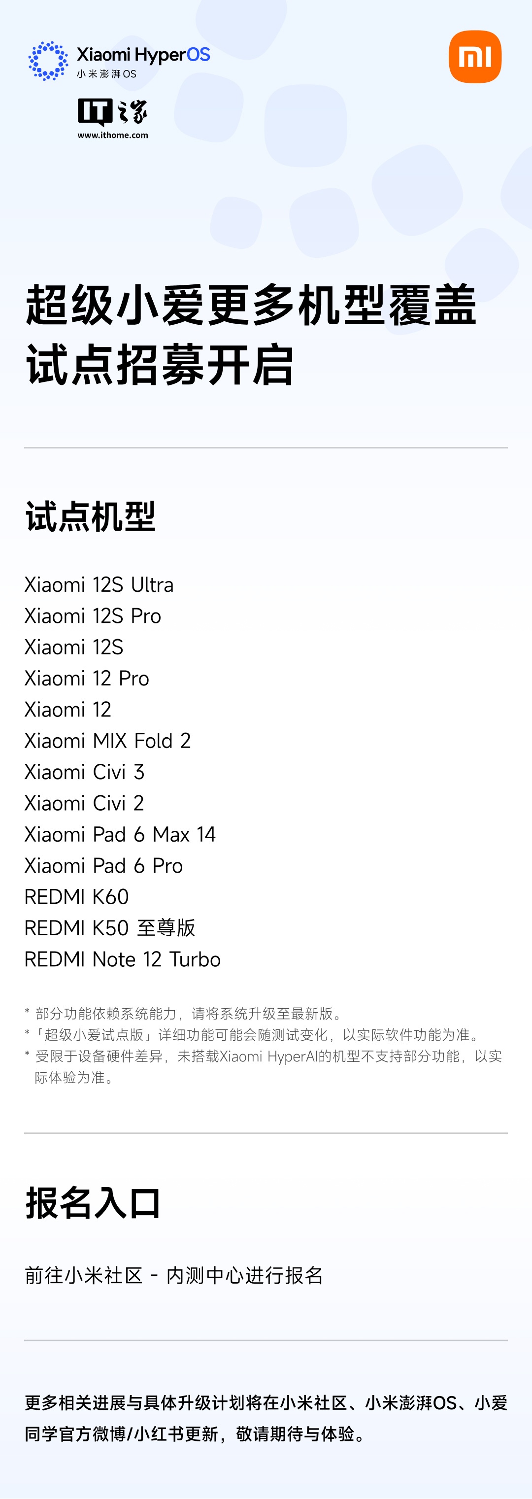 据IT之家此前报道,小米智能助手官方微博本月发文宣布,「超级小爱更多机型覆盖试点招募」现已开启。据介绍,更多老机型(含 Xiaomi 12S Ultra、Civi 3 等)可更新使用超级小爱,用户需前往小米社区报名体验。