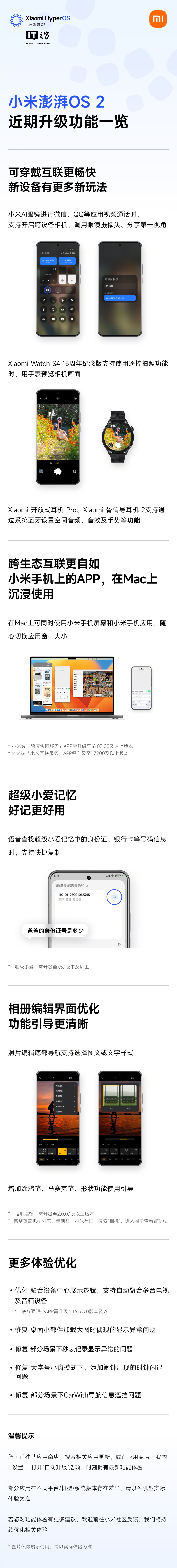 IT之家 8 月 18 日消息,小米澎湃 OS 官方微博今日发布了澎湃 HyperOS 2 本月升级功能一览。据介绍,本次升级将带来跨设备调用镜头、语音查找超级小爱中的信息等功能。具体如下: