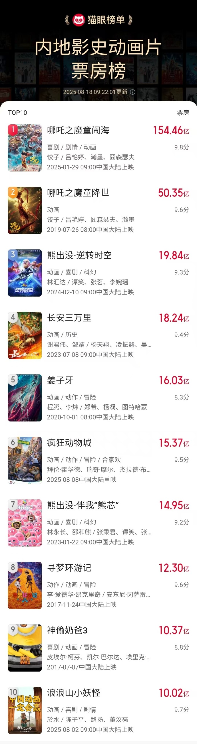 IT之家 8 月 18 日消息,据猫眼专业版数据,电影《浪浪山小妖怪》累计票房突破 10.026 亿,超《功夫熊猫 3》,进入中国影史动画电影票房榜前十。值得一提的是,这也是中国影史首部票房破 10 亿二维动画电影。