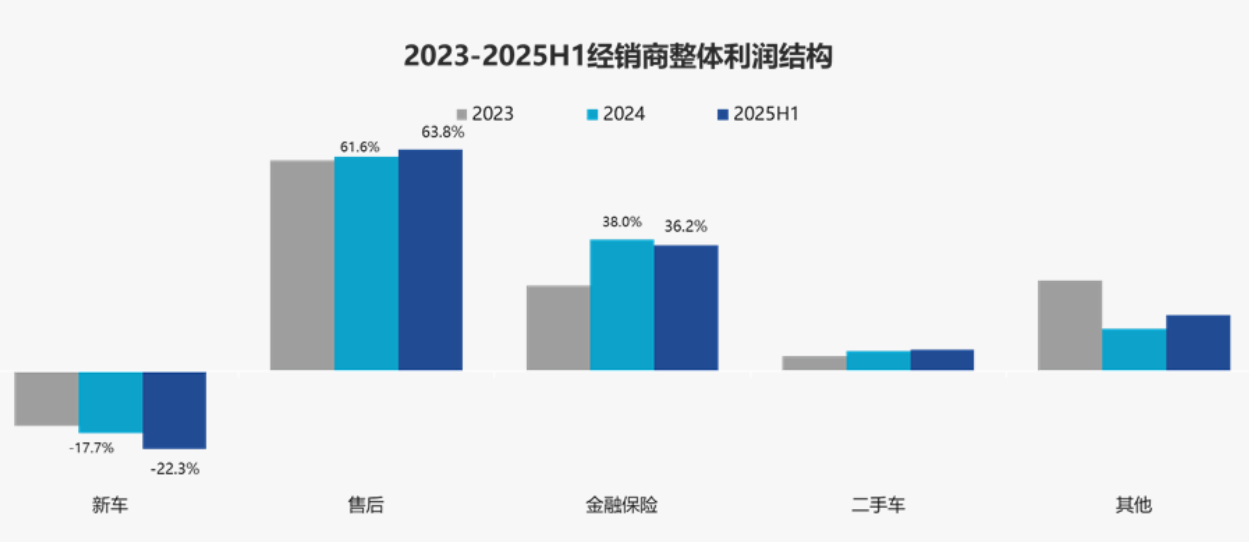 在经销商的毛利构成中,新车、售后和金融保险的毛利贡献分别为-22.3%、63.8% 和 36.2%。新车销售毛利贡献仍为负数,且新车亏损进一步加剧。售后服务毛利贡献略有增加,而金融保险的毛利贡献则出现一定程度回落。