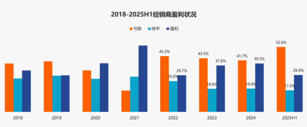 调查显示,2025 年上半年汽车经销商亏损比例上升至 52.6%,持平比例 17.5%,盈利比例 29.9%。本次调查回收的有效问卷中,新能源独立品牌的经销商或者代理商,占据了 29.5% 的比例,与上年度相比,样本量进一步扩大。