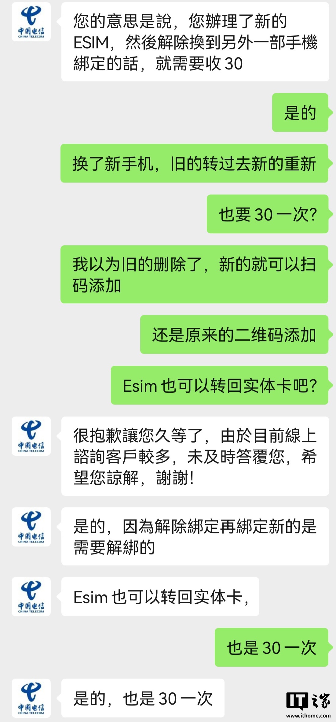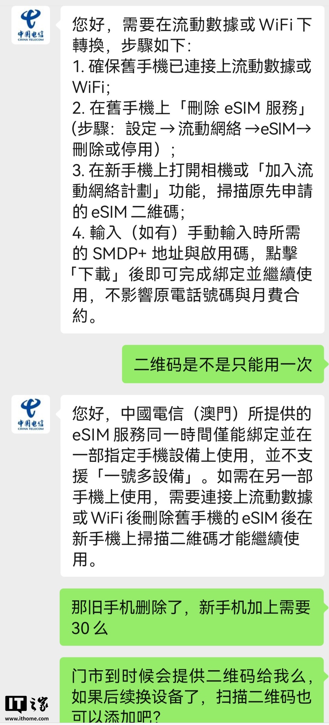 首次办理这项服务将不收取费用,但之后每一次办理实体 SIM>eSIM、eSIM > 实体 SIM、旧手机 eSIM > 新手机 eSIM 时将收取 30 澳门元(IT之家注:现汇率约合人民币 26.79 元)的费用。