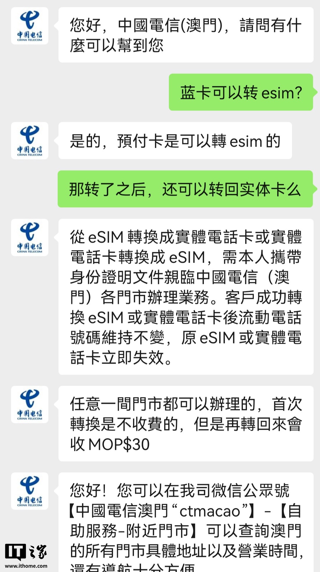 据中国电信澳门客服人员所述,目前开通这项业务需要本人携带身份证明文件(内地身份证、澳门身份证、外地雇员身份证等)前往中国电信澳门各大线下门店办理,支持双向转换,成功转换后电话号码不变,但原有的实体 SIM 或 eSIM 将立即失效。