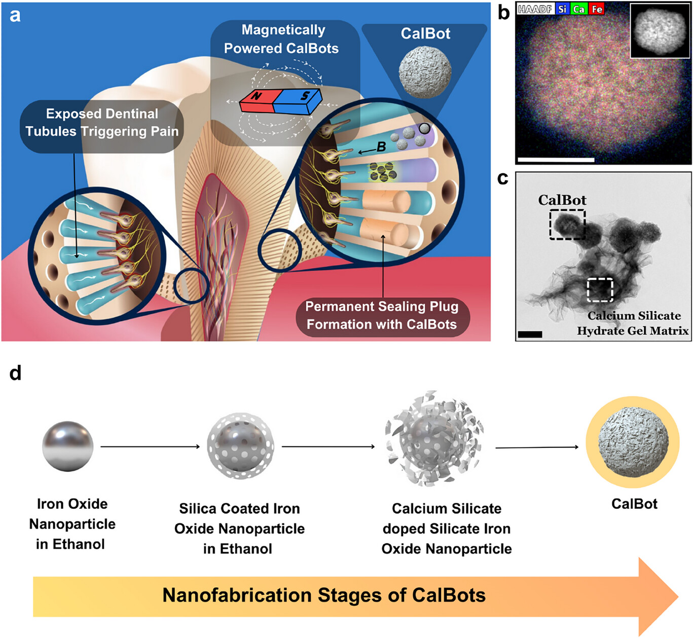 印度科学研究院的团队针对该难题,开发出新型纳米机器人 CalBot。每个 CalBot 实际上是直径约 400 纳米的磁性氧化铁纳米颗粒,表面包覆专有的钙硅基生物陶瓷材料,这种设计既具生物相容性,又能在牙本质小管内形成坚固的封堵结构。