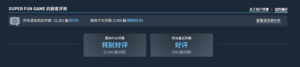 Steam 随后引入了“评测分数”的概念,这是基于好评所占百分比进行的一个简单分类。评测分数基本上表明了游戏的整个玩家社区对于其所购游戏的满意度如何,也是潜在顾客预测自己对某款游戏会有多满意的有效工具。