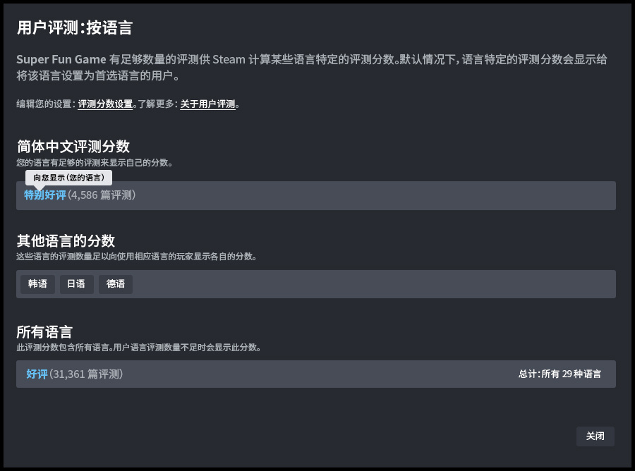 IT之家 8 月 19 日消息,Valve 昨日(8 月 18 日)发布公告,宣布为了避免特定语言用户集中差评某个游戏,Steam 平台上的部分游戏现在会按照不同语言显示评分,从而帮助玩家在购买新游戏的时候做出明智的决定。