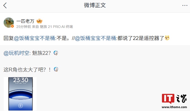 同时星纪魅族集团中国区 CMO 万志强曾表示,魅族 22 手机的屏幕比例“不是遥控器”,此前魅族曾表示这款手机定位“AI 时代小屏旗舰”,号称“挑战最佳小屏握持手感”。