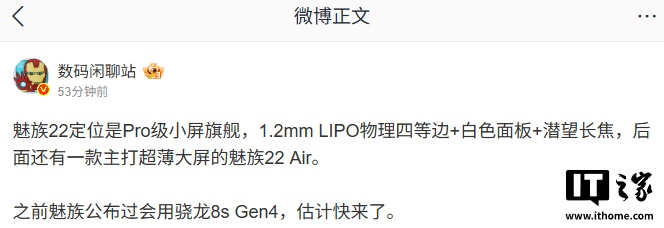IT之家 8 月 19 日消息,博主 @数码闲聊站 今天在微博透露,魅族 22 手机现已三证齐全,支持 80W 有线充。