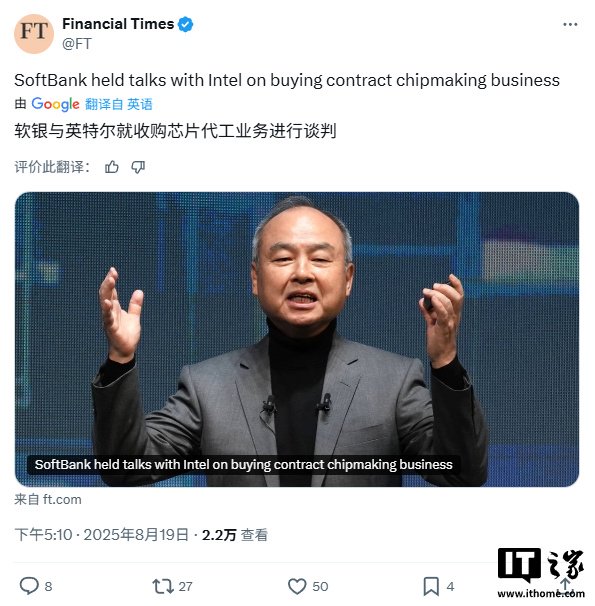 《金融时报》今晚报道称,软银创始人兼社长孙正义数周前曾与英特尔 CEO 陈立武就收购其表现不佳的芯片代工业务进行会谈。