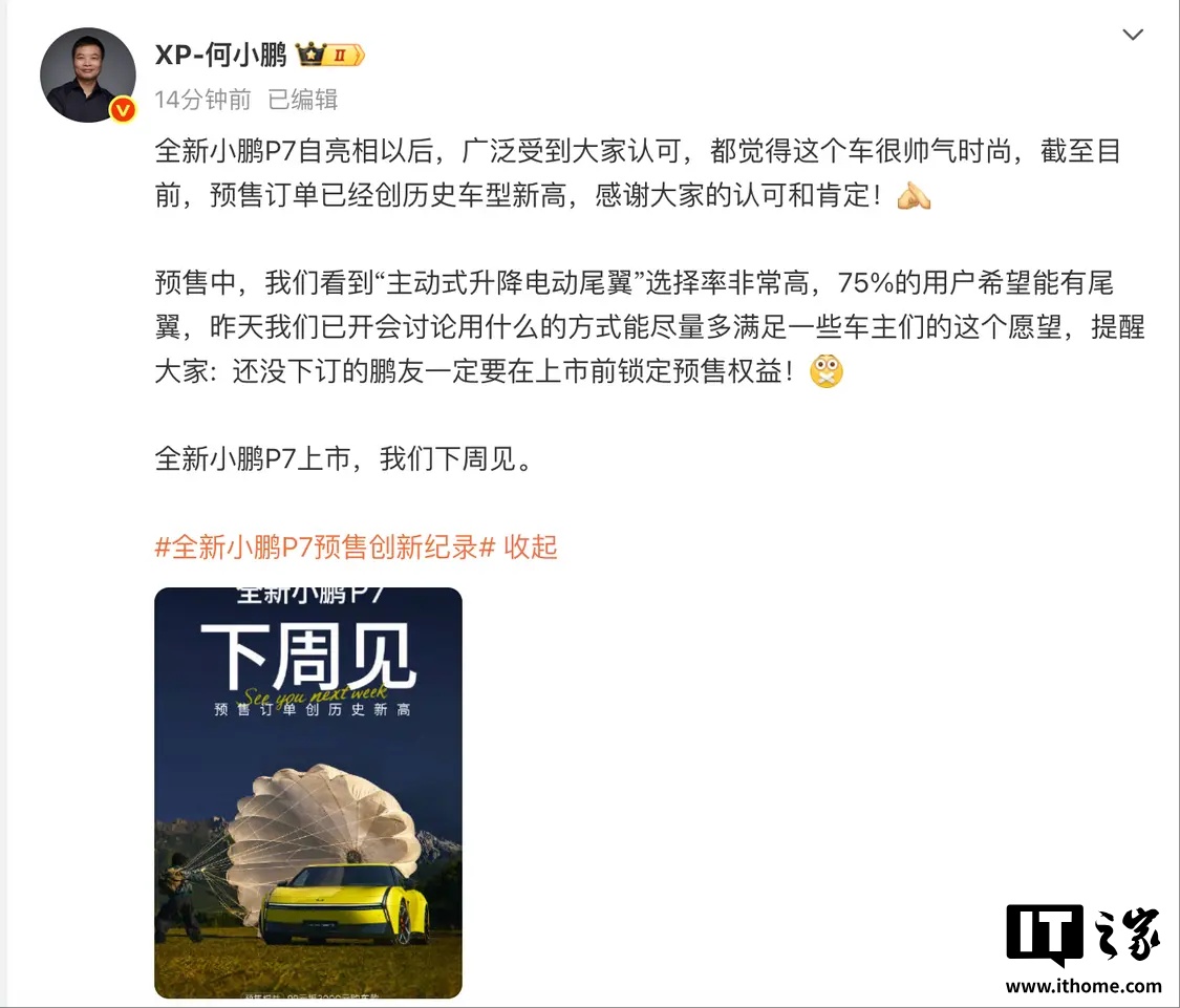 此外,小鹏汽车董事长何小鹏发文称,目前全新小鹏 P7 预售订单已经创历史车型新高,预售中,75% 的用户希望能有“主动式升降电动尾翼”,并已开会讨论怎样尽量满足车主们的这个愿望。