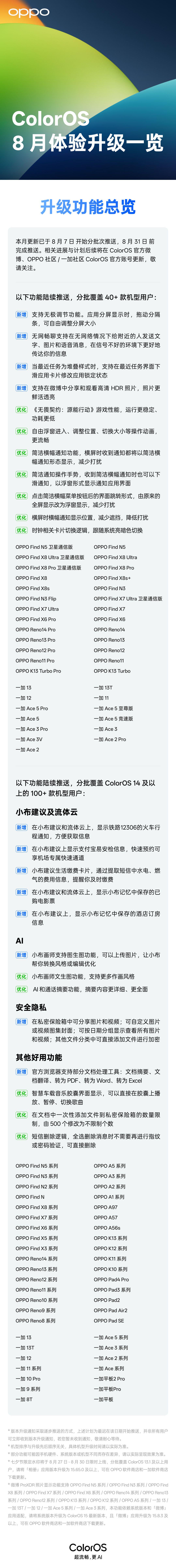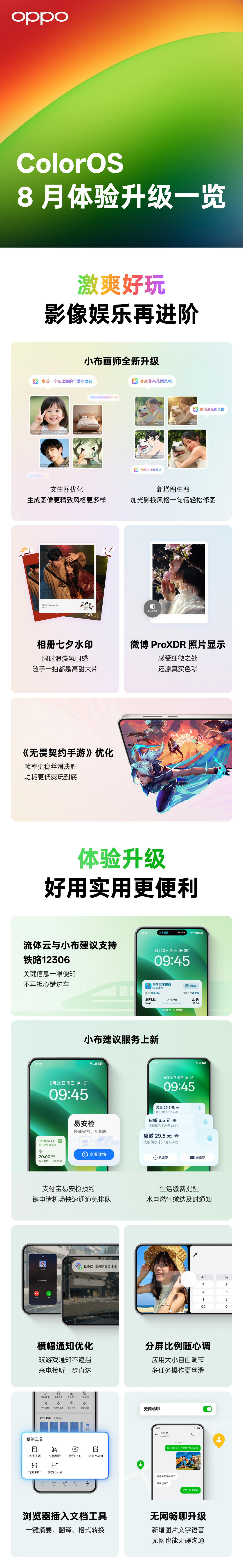 IT之家 8 月 20 日消息,OPPO 今天通过 ColorOS 官微揭晓了八月体验升级,包括小布画师文生图优化、新增图生图;流体云与小布建议支持铁路 12306,以及无网畅聊升级新增图片文字语音、分屏比例随心调等。