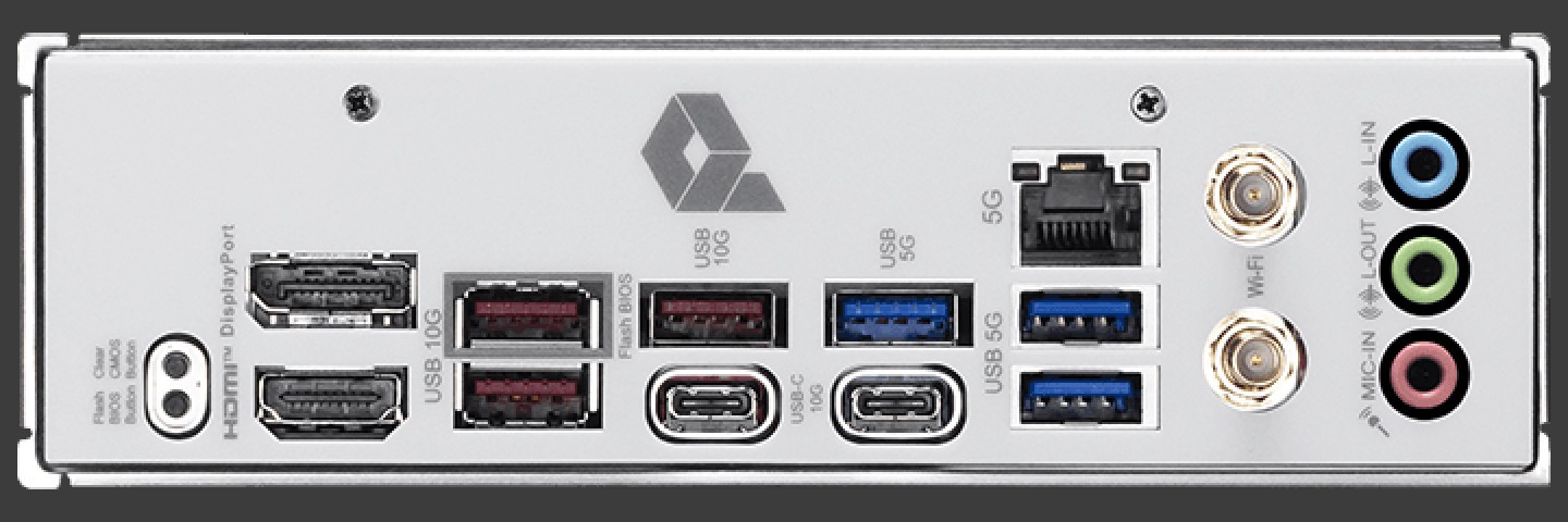 后置接口:1× HDMI 2.1 TMDS、1× DisplayPort 1.4、3× USB-A 10Gbps、2× USB-A 10Gbps、3× USB-A 5Gbps、1× 5GbE RJ45、一对 Wi-Fi 天线插孔、3× 音频插孔。