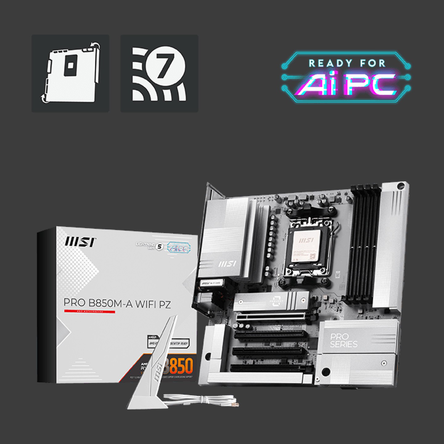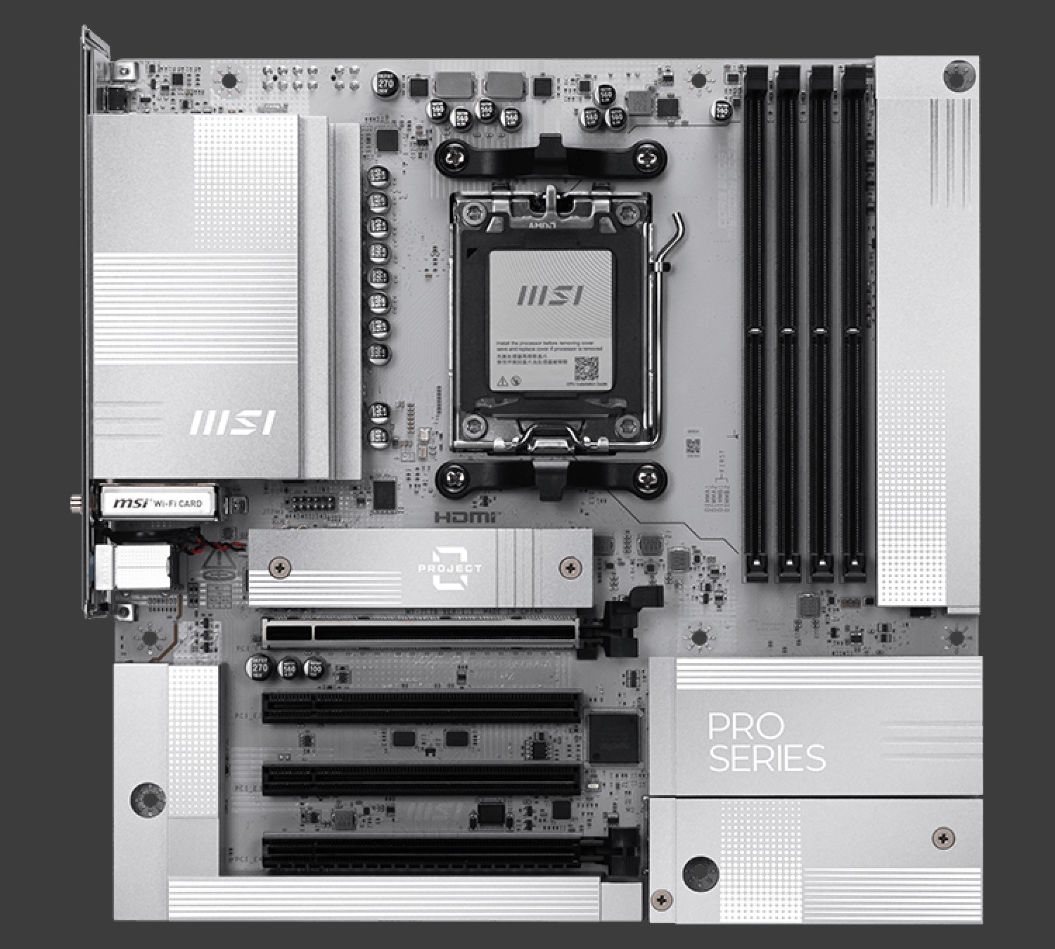 PRO B850M-A WIFI PZ 采用标准 M-ATX 外形规格,整体为银白配色,内存插槽、PCIe 插槽、处理器散热器固定框架等仍为黑色。其 基于 6 层 2 盎司铜 PCB,配备 8 (60A SPS DrMOS)+2+1 相供电,背部拥有 4+8-Pin 的 EPS CPU 供电接口。