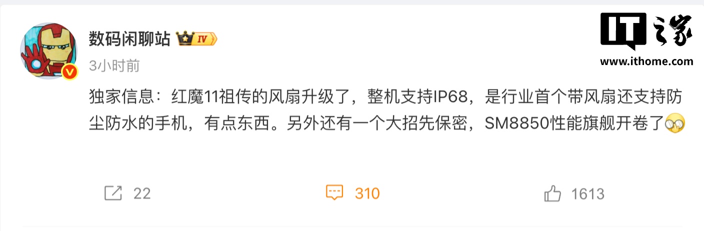 IT之家 8 月 20 日消息,@数码闲聊站 今天上午放出爆料称,红魔 11“祖传”的风扇将迎来升级,同时整机支持 IP68,是行业首个带风扇还支持防尘防水的手机。他同时还表示,该机“还有一个大招”先保密,SM8850 性能旗舰“开卷”。