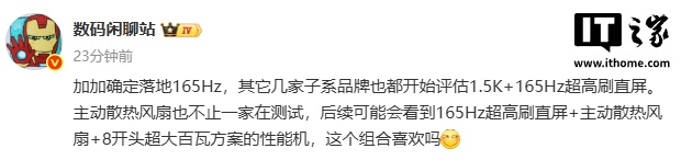 此外,该博主还爆料称,主动散热风扇也不止一家在测试,后续可能会看到 165Hz 超高刷直屏 + 主动散热风扇 + 8 开头超大百瓦方案的性能机。