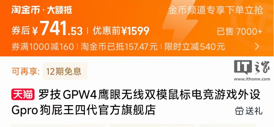罗技 GPW4 鹰眼电竞鼠标(PRO X LIGHTSPEED 2 DEX)国行去年 9 月开售,该款鼠标搭载 HERO 2 传感器、8000Hz 轮询率,首发价 1199 元,今日官方直降至 899 元 + 12 期免息。