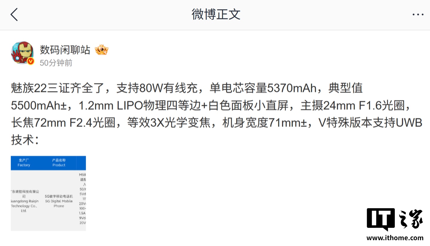 IT之家注意到,魅族 22 手机现已三证齐全,支持 80W 有线充。博主 @数码闲聊站 爆料称,这台手机的单电芯容量是 5370mAh,典型值为 5500mAh±,具备“1.2mm LIPO 物理四等边 + 白色面板”小直屏,机身宽度 71mm±,“V 特殊版本”还支持 UWB(IT之家注:超宽带)技术。