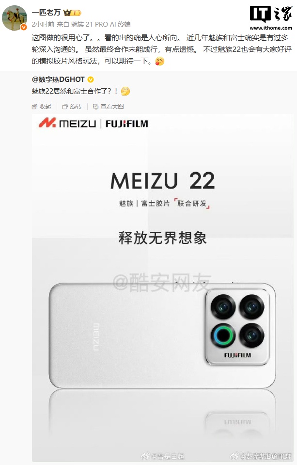 IT之家 8 月 20 日消息,星纪魅族集团中国区 CMO 万志强今日发文,称近几年魅族和富士确实是有过多轮深入沟通的。虽然最终合作未能成行,有点遗憾。不过魅族 22 也会有大家好评的模拟胶片风格玩法,可以期待一下。