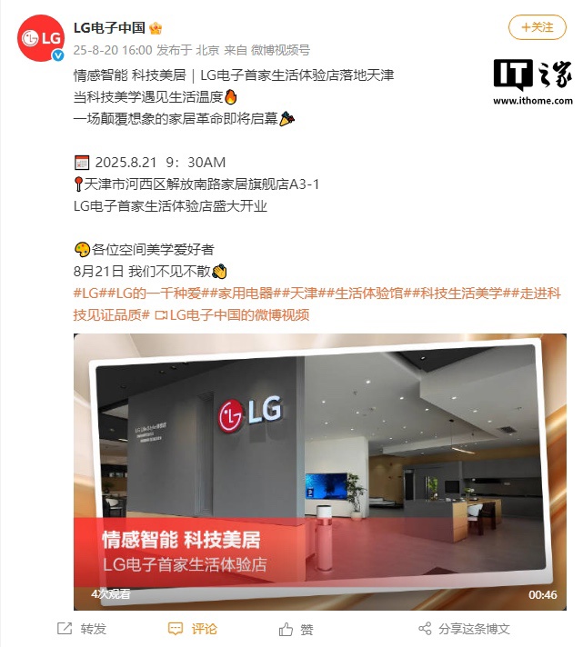 IT之家 8 月 20 日消息,“LG 电子中国”官方微博发文,宣布 LG 电子首家生活体验店正式落地天津,将于明天(8 月 21 日)9 点 30 分开业。