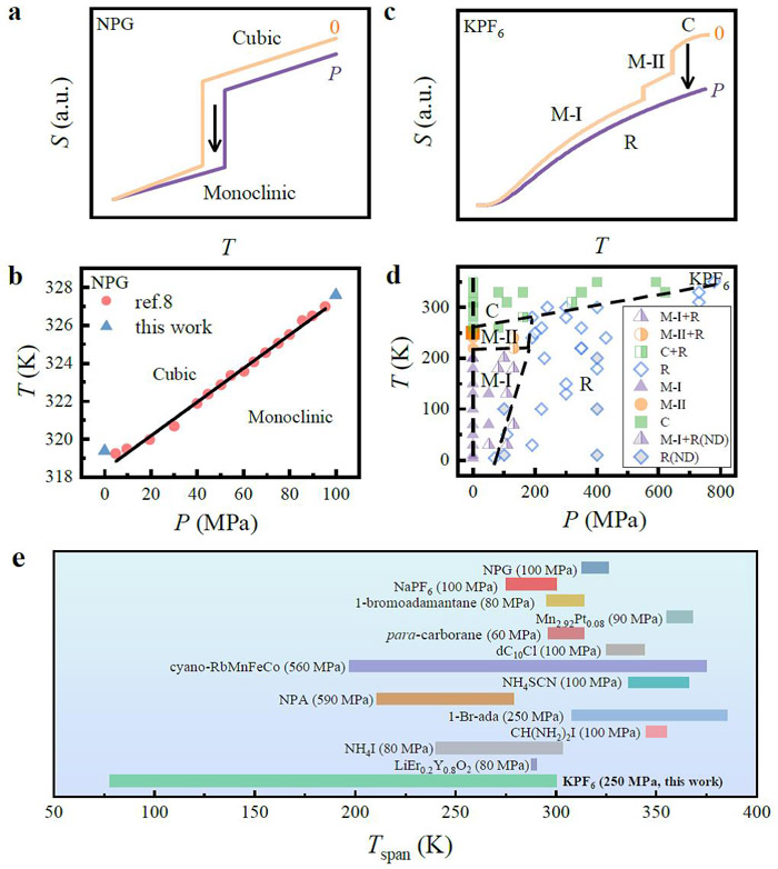 ▲ 图 1.传统压卡效应与全温区压卡效应的比较。新戊二醇的熵-温度曲线示意图(a)和高压相图(b),KPF6 的熵-温度曲线示意图(c)和高压相图(d),代表性压卡材料制冷温区的对比(e)。