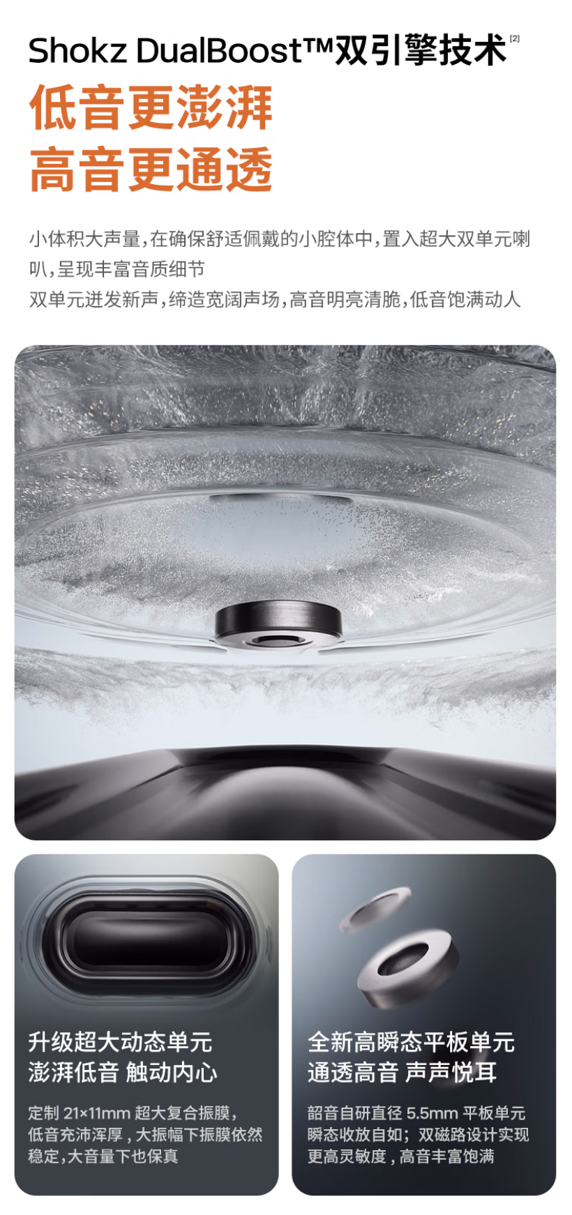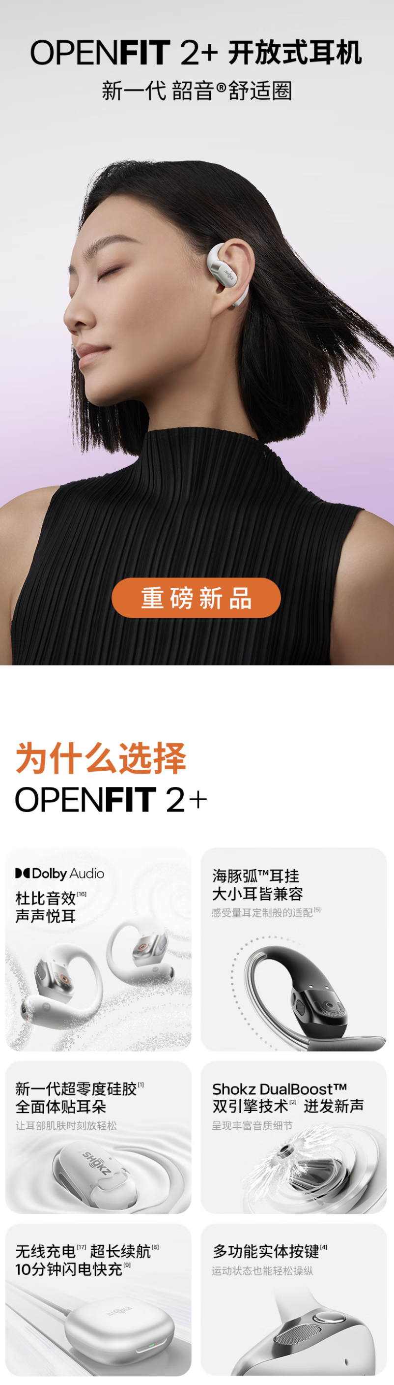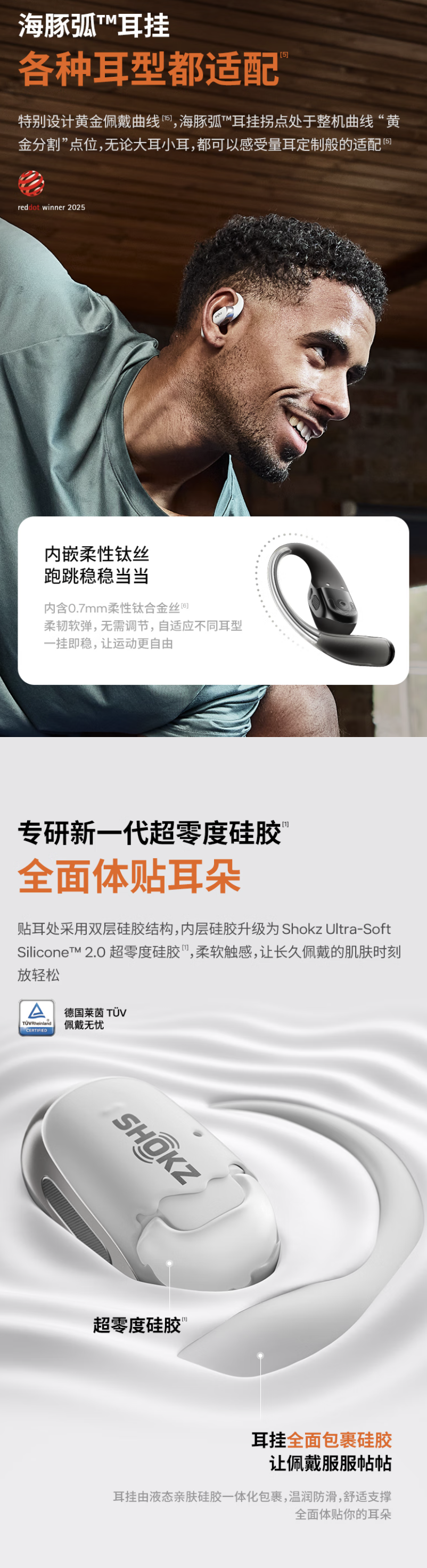 据介绍,这款耳机支持 IP55 抗水防尘,采用左右分体挂耳式海豚弧耳挂设计,贴耳处采用双层硅胶包裹,内层硅胶升级为 Shokz Ultra-Soft Silicone 2.0 超零度硅胶,耳挂内嵌 0.7mm 极细柔性钛合金丝,号称“即使用户进行大幅度运动,耳机都不会掉落或位移”。