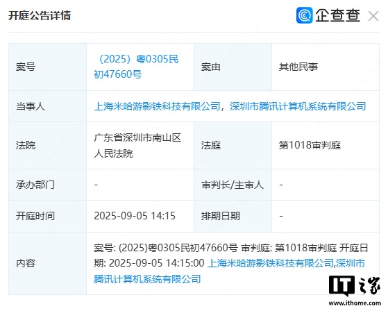 IT之家 8 月 20 日消息,上海米哈游影铁科技有限公司、深圳市腾讯计算机系统有限公司之间新增了一项“其他民事”诉讼案件,案号为(2025)粤 0305 民初 47660 号。