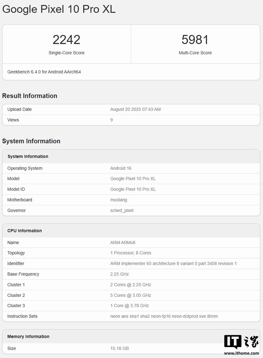 IT之家 8 月 21 日消息,基于 GeekBench 6.4.0 跑分库数据,谷歌 Pixel 10 Pro XL 单核得分为 2242 分,多核得分为 5981 分,相比较前代单核方面提升 14.15%,多核方面提升 28.07%。