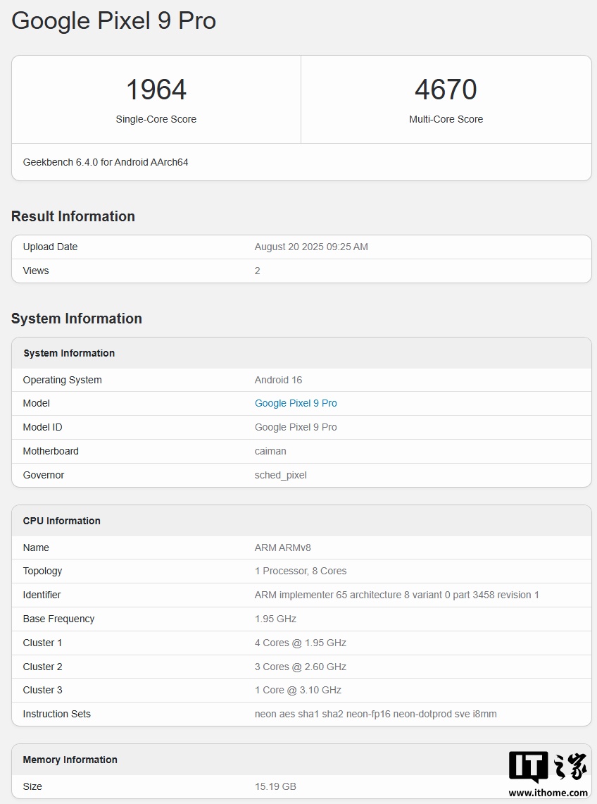 IT之家查询 GeekBench 跑分库,8 月 20 日谷歌 Pixel 10 Pro XL 手机共有 8 条记录,为公平对比 Pixel 9 Pro XL 手机,剔除 6.3.0 版本(得分更高,单核 2329 分、多核 6358 分),挑选最高得分为单核为 2242 分,多核 5981 分。