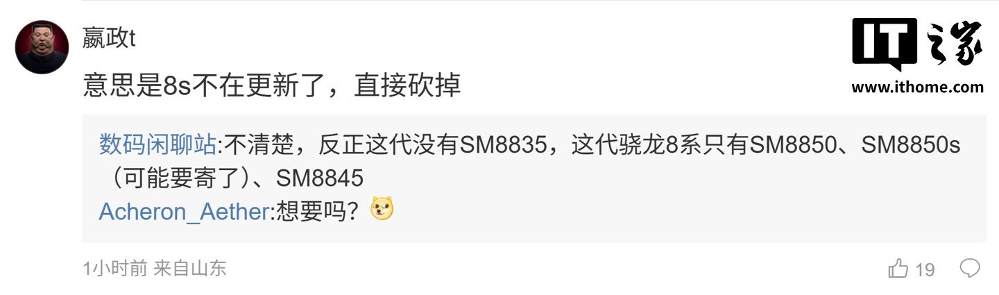 另一名用户询问道:“意思是 8s 不在更新了,直接砍掉”,博主则回复道:“不清楚,反正这代没有 SM8835,这代骁龙 8 系只有 SM8850、SM8850s(可能要寄了)、SM8845”。