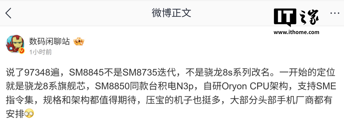IT之家在此援引博主表述,这款芯片一开始的定位就是“骁龙 8 系旗舰芯”,不是骁龙 8s 系列改名,拥有 SM8850 同款台积电 N3P 制程工艺,自研 Oryon CPU 架构,支持 SME 指令集。