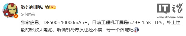 据爆料,该机配备 10000mAh± 电池,目前工程机开屏是 6.79± 英寸 1.5K LTPS,配备兼顾性能的超大电池,听说机身厚度也还不错。此外,他还在评论区透露,这款新机排期在明年上半年。