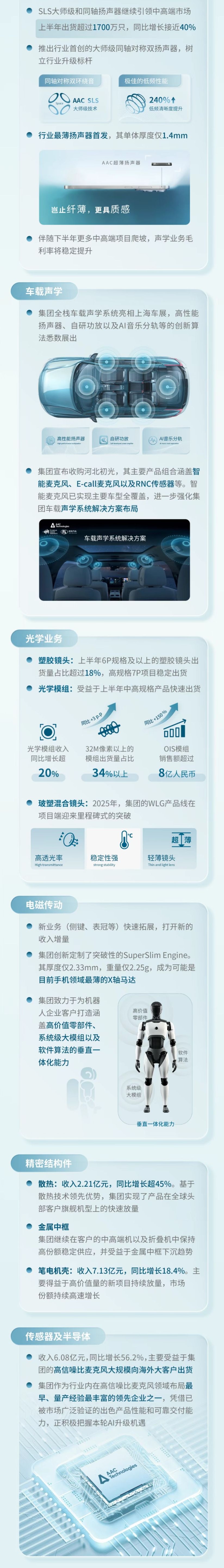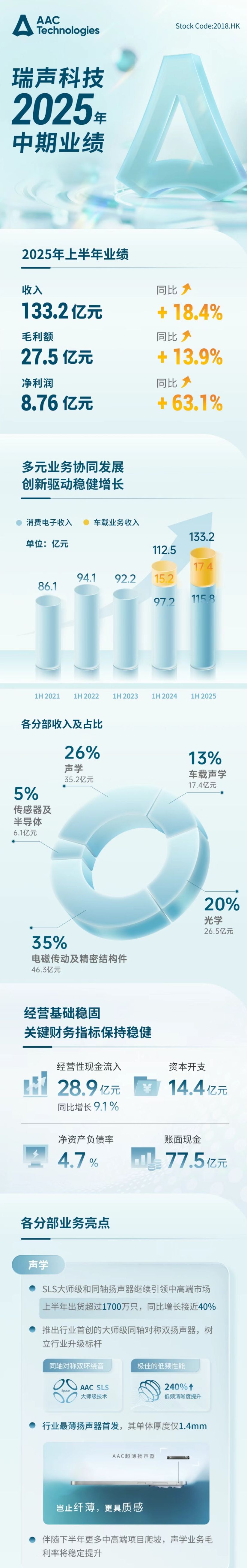 IT之家 8 月 21 日消息,瑞声科技今日发布 2025 年中期业绩。公司上半年业绩收入 133.2 亿元,同比增长 18.4%。其中,消费电子收入 115.8 亿元,车载业务收入 17.4 亿元。