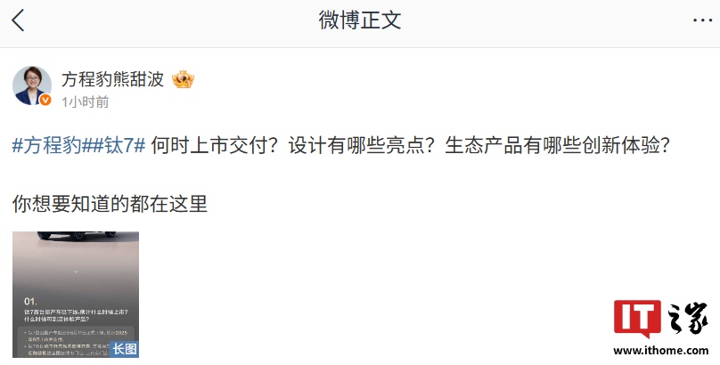 IT之家 8 月 21 日消息,比亚迪集团-方程豹事业部总经理熊甜波今日发布了“方程豹钛 7「答网友问」第 2 期”,针对新车何时上市交付、设计有哪些亮点、生态产品有哪些创新体验等问题进行了解答。