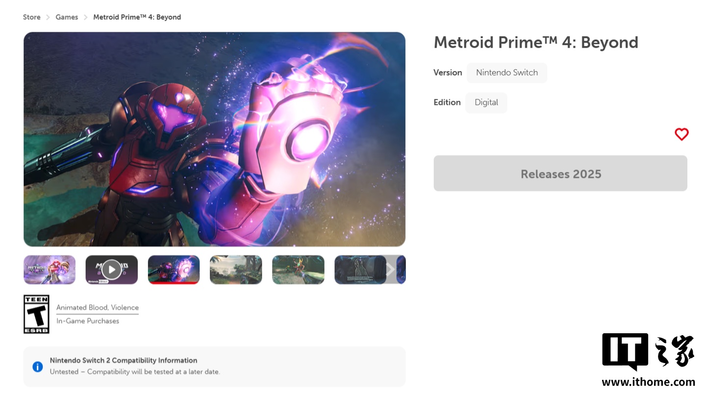 IT之家查询美区 eShop 商店后发现,《密特罗德 究极 4 穿越未知》获得了 ESRB 的“青少年(T)”评级,适合 13 岁以上的玩家体验,游戏中含有动画化的血液表现、暴力内容,具备游戏内购买特性。