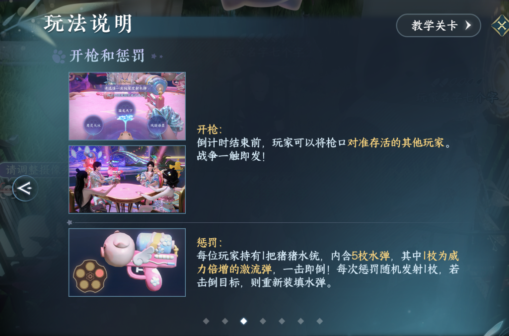 惩罚机制:每位玩家持有 1 把猪猪水铳,内含 5 枚水弹,其中 1 枚为威力倍增的激流弹,一击即倒!每次惩罚随机发射 1 枚,若击倒目标,则重新装填水弹。