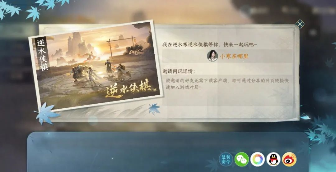 开发组还为各位热爱玩逆水侠棋的玩家准备好了可自由分享的游玩链接,无需下载客户端,就能和好友们在微信、QQ、浏览器等任何地方快速游玩逆水侠棋。