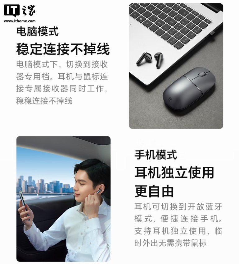 据介绍,荣耀亲选悦喔无线耳鼠 Pro 的耳机和鼠标支持免配对即插即用,同时提供双模一键切换功能,用户在使用过程中,可以快速接入电话会议等。在电脑模式下,耳机和鼠标会连接专属接收器同时工作;在手机模式下,耳机可切换到开放蓝牙模式,独立使用。