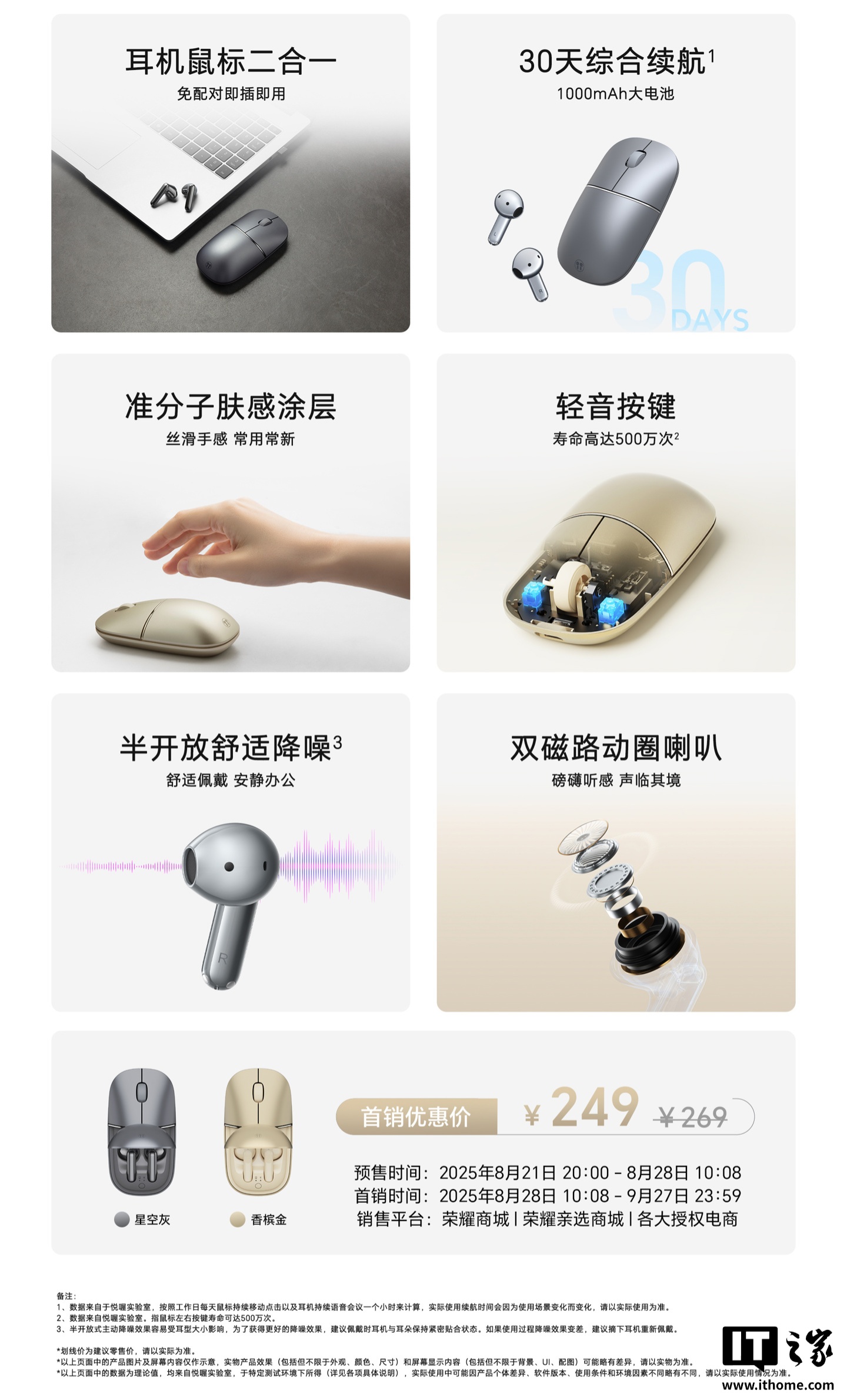 IT之家 8 月 21 日消息,荣耀亲选悦喔无线耳鼠 Pro 今日开启预售,新品采用耳机鼠标二合一创新设计、支持半开放降噪功能,定价 269 元、首发 249 元。