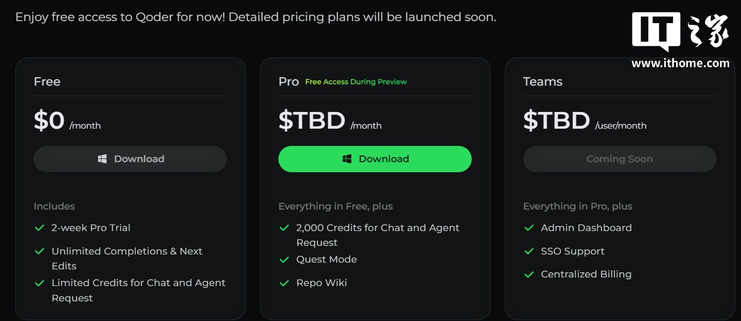 IT之家查询 Qoder 官网,Qoder 支持 Windows 和 macOS 版本,目前可免费使用,详细定价计划即将推出。
