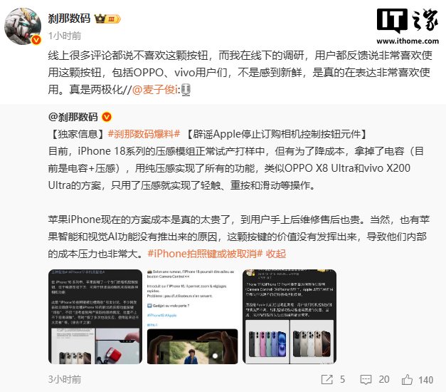 IT之家 8 月 22 日消息,此前有消息称,苹果已经向供应商伙伴说明不再订购相机控制按键,因此 iPhone 17、iPhone 17 Pro 系列可能是最后拥有相机控制(Camera Control)的 iPhone 机型了。对此,博主 @刹那数码给出了不同的答案。