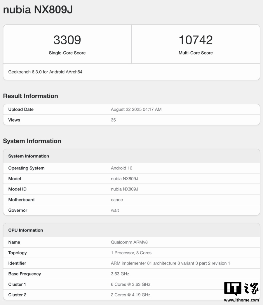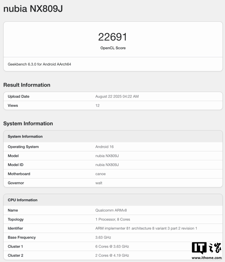IT之家 8 月 22 日消息,今日,一款型号为 NX809J 的努比亚新机现身 Geekbench 跑分平台,预计为红魔 11 系列游戏手机。