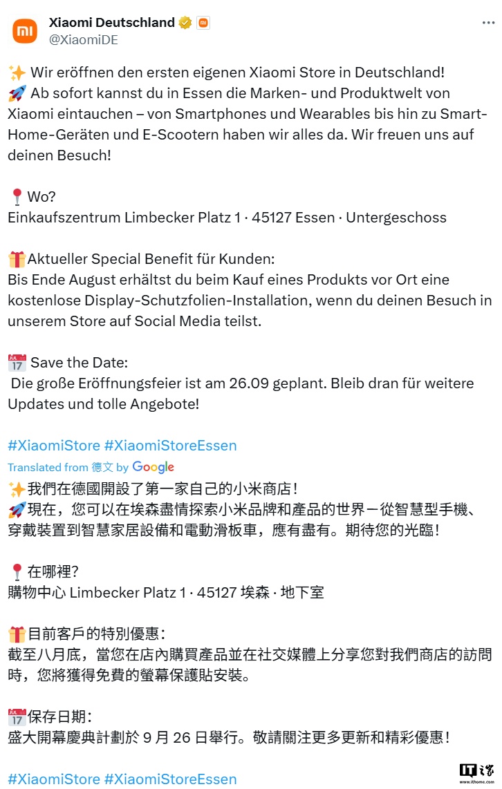 IT之家 8 月 22 日消息,小米德国本周(8 月 19 日)在 X 平台宣布,其位于北莱茵-威斯特法伦州埃森市的第一家官方直营店已开启试营业,将在 9 月 26 日举行开业典礼。